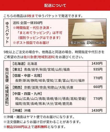 それ以上の枚数の場合や、他商品と同送の場合、または時間指定や代引きをご希望の方は佐川急便(地域別送料)をお選びください。 |