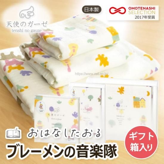 天使のガーゼ 日本製 2017年オモテナシコレクション受賞 おはなしたおる ブレーメンの音楽隊 バスタオル ギフト箱入り みんなが大好きな童話やむかし話がタオルになりました。ベビーも大人もよろこぶ、ふんわりやわらかな肌触りです。