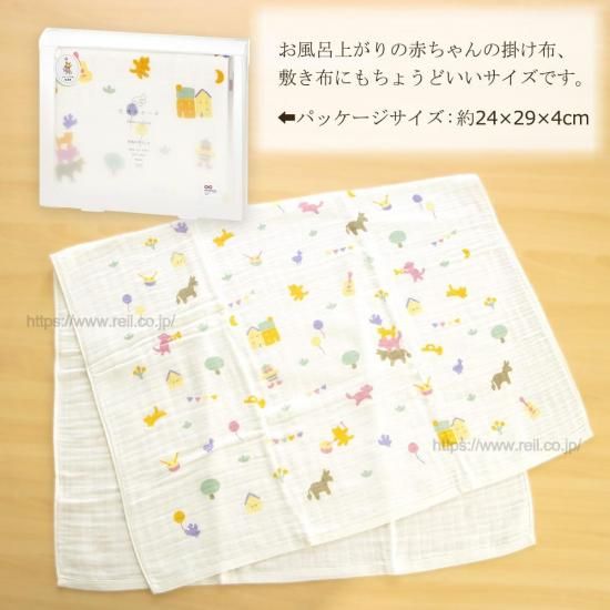 ふんわりとした肌触りが特徴です。(パイル部分に50%使用しています)お風呂上がりの赤ちゃんの掛け布、敷き布にもちょうどいいサイズです。箱サイズは縦約24cm、横幅約29cm、厚み約4cm。