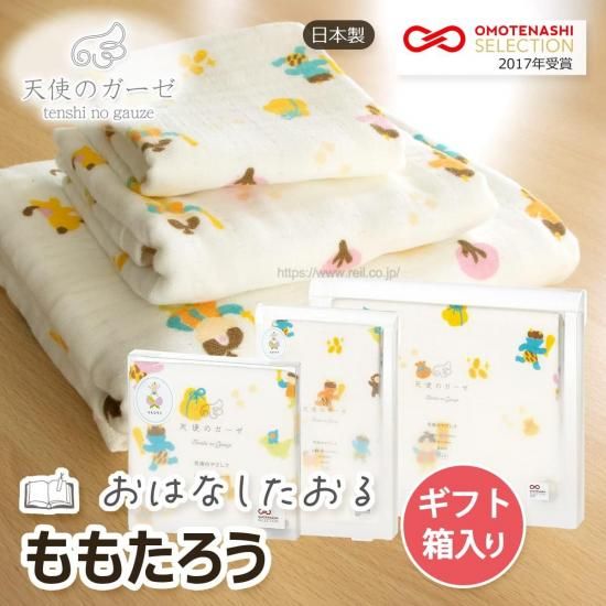 天使のガーゼ 日本製 2017年オモテナシコレクション受賞 おはなしたおる モモタロウ バスタオル ギフト箱入り みんなが大好きな童話やむかし話がタオルになりました。ベビーも大人もよろこぶ、ふんわりやわらかな肌触りです。