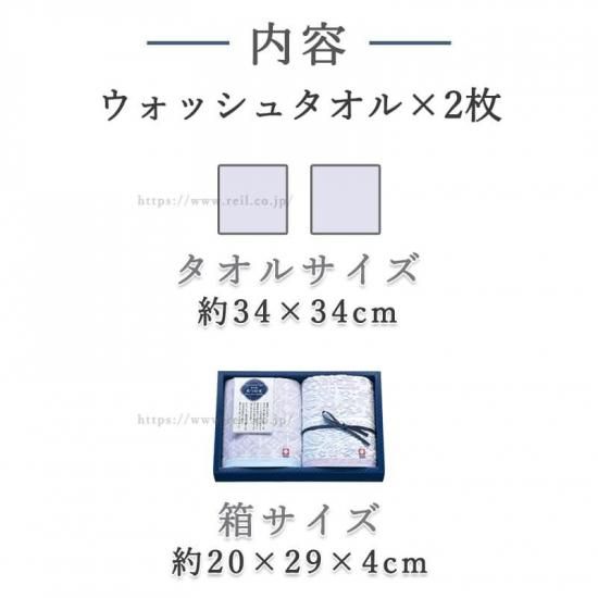 セット内容はウォッシュタオル2枚。箱サイズは横約29cm、縦約20cm、高さ約約4cm。日本製。綿100%。今治タオルブランド認定商品。