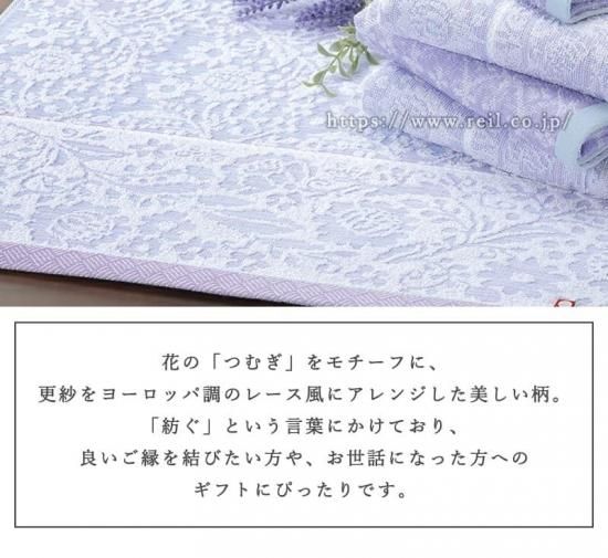 愛媛県今治市は山や川、海に囲まれた美しいところ。いにしえの『伊予の国』の時代から、春夏秋冬 咲きつぐ花のように百二十年以上受け継がれてきた『誇り高き巧みの技』。糸を紡ぎ、一枚の布に織り上げ、大自然の恩恵から得た豊かな水で洗い仕上げました。花の「つむぎ」をモチーフに、 更紗をヨーロッパ調のレース風にアレンジした美しい柄。 「紡ぐ」という言葉にかけており、 良いご縁を結びたい方や、お世話になった方への ギフトにぴったりです。