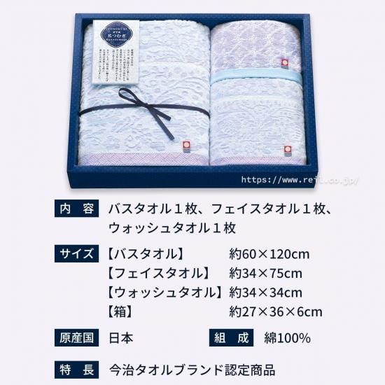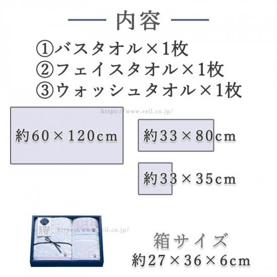 セット内容はバスタオル1枚 フェイスタオル1枚 ウォッシュタオル1枚。箱サイズは横約36cm、縦約27cm、高さ約6cm。日本製。綿100%。今治タオルブランド認定商品。