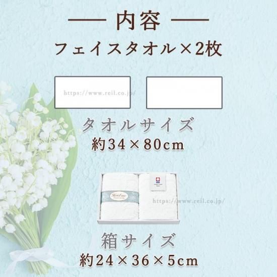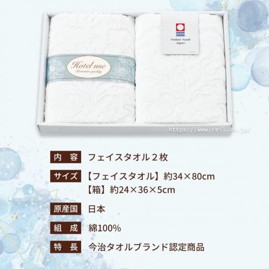 セット内容はフェイスタオル2枚。箱サイズは横約36cm、縦約24cm、高さ約約5cm。日本製。綿100%。今治タオルブランド認定商品。