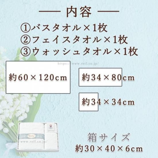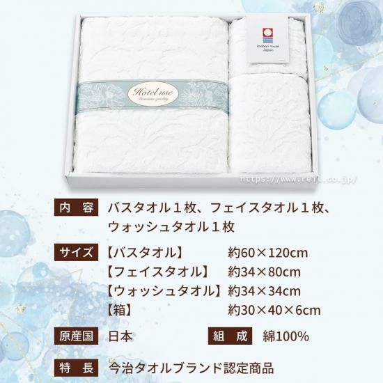 セット内容はバスタオル1枚、フェイスタオル1枚、ウォッシュタオル1枚。箱サイズは横約40cm、縦約30cm、高さ約約6cm。日本製。綿100%。今治タオルブランド認定商品。