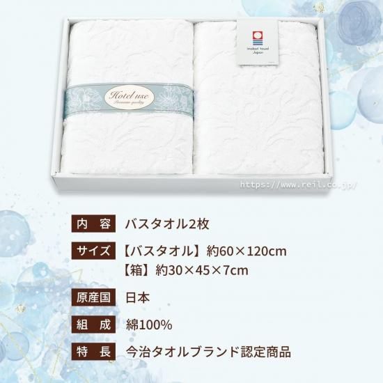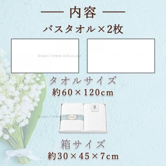 セット内容はバスタオル2枚。箱サイズは横約45cm、縦約30cm、高さ約約7cm。日本製。綿100%。今治タオルブランド認定商品。