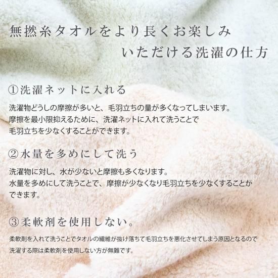 毛羽落ちが少なく、綿雪のように軽くふわふわとした風合いに仕上がっています。