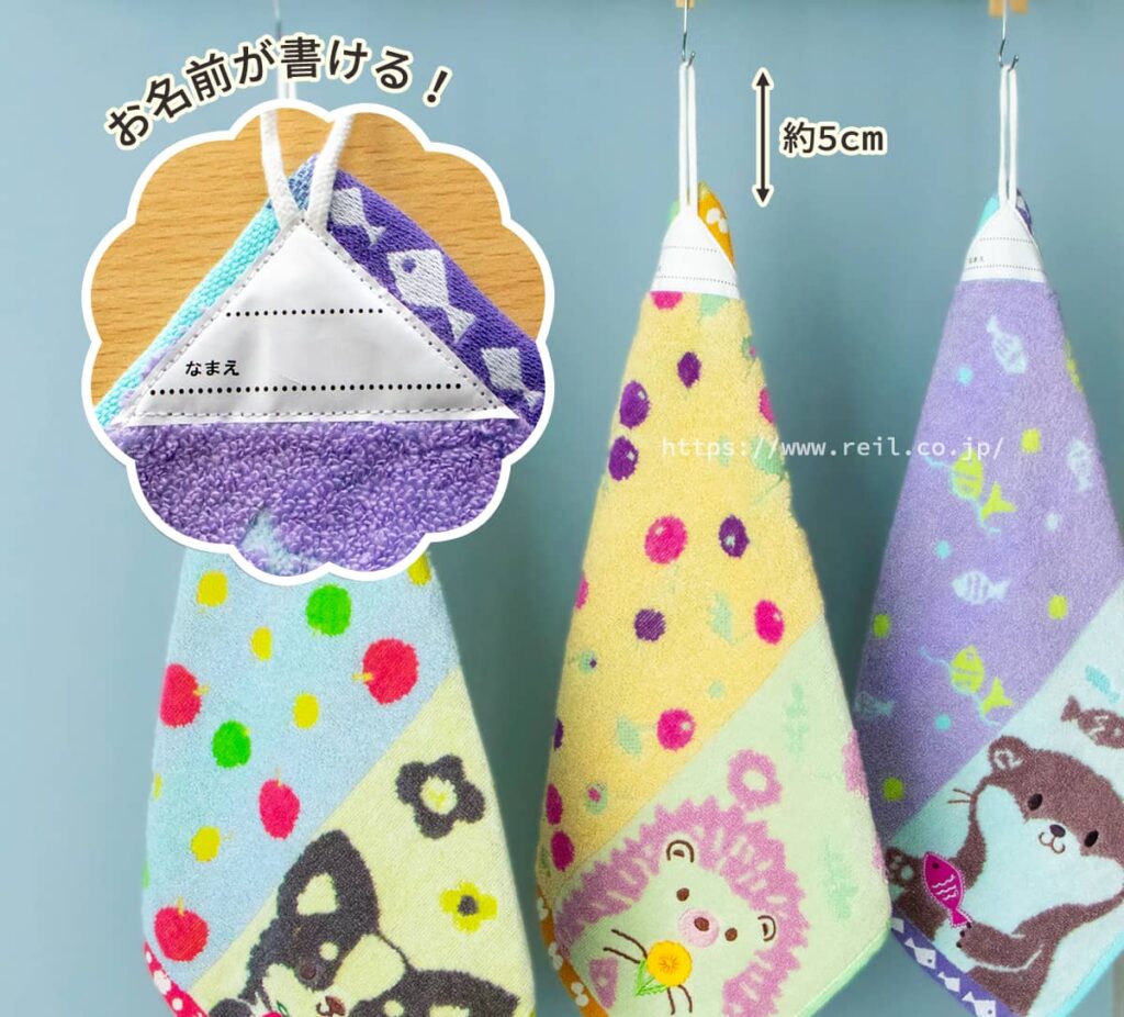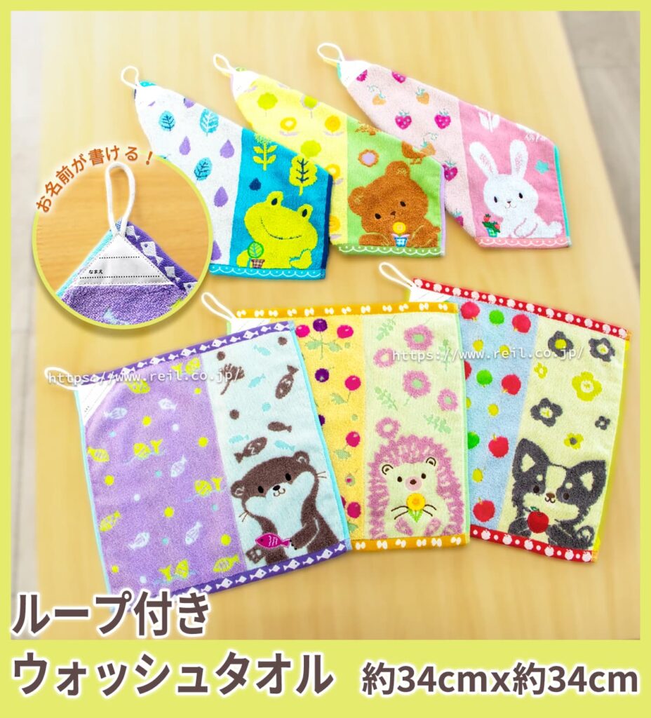 ループ付きウォッシュタオルはお名前の書けるタグが付いており、